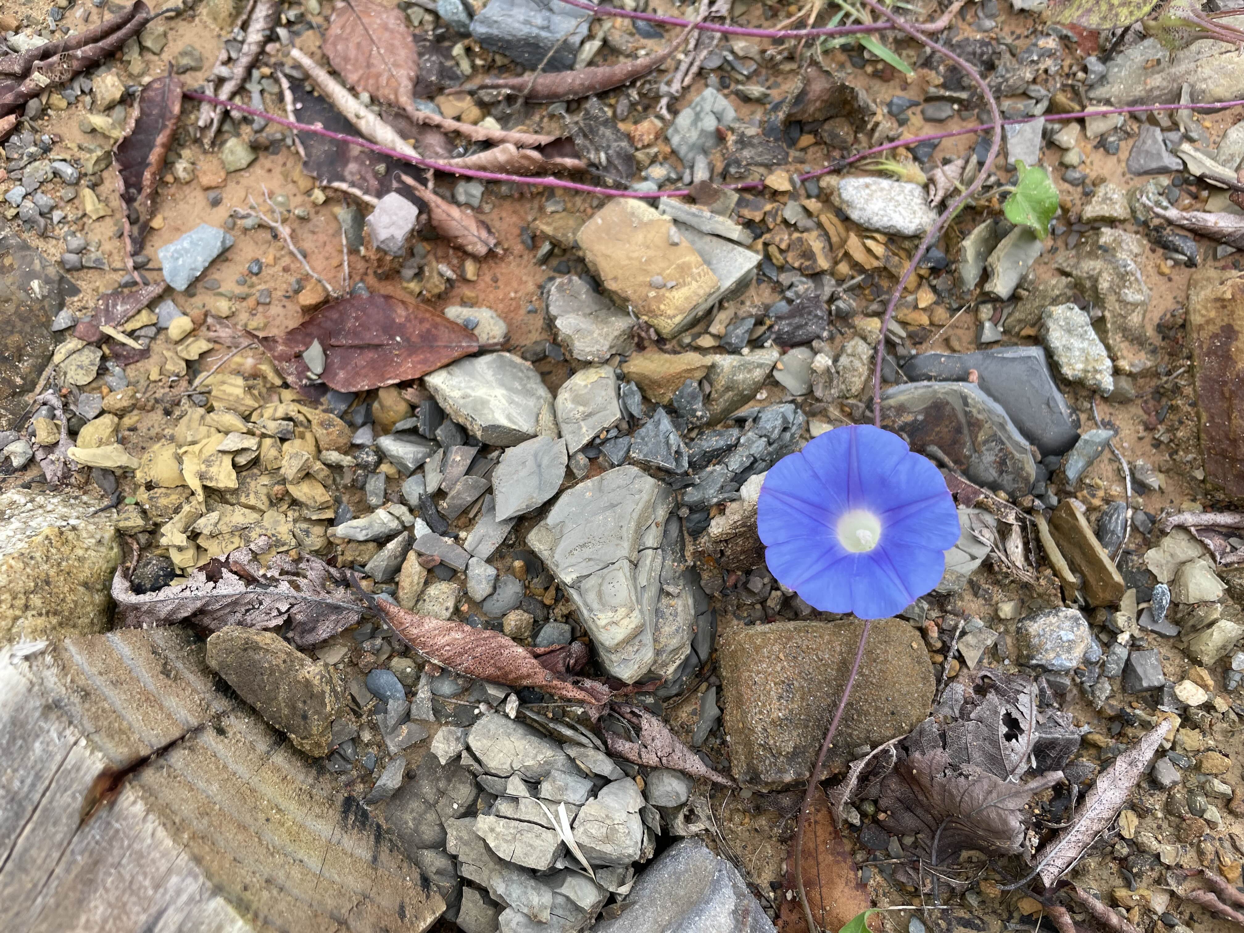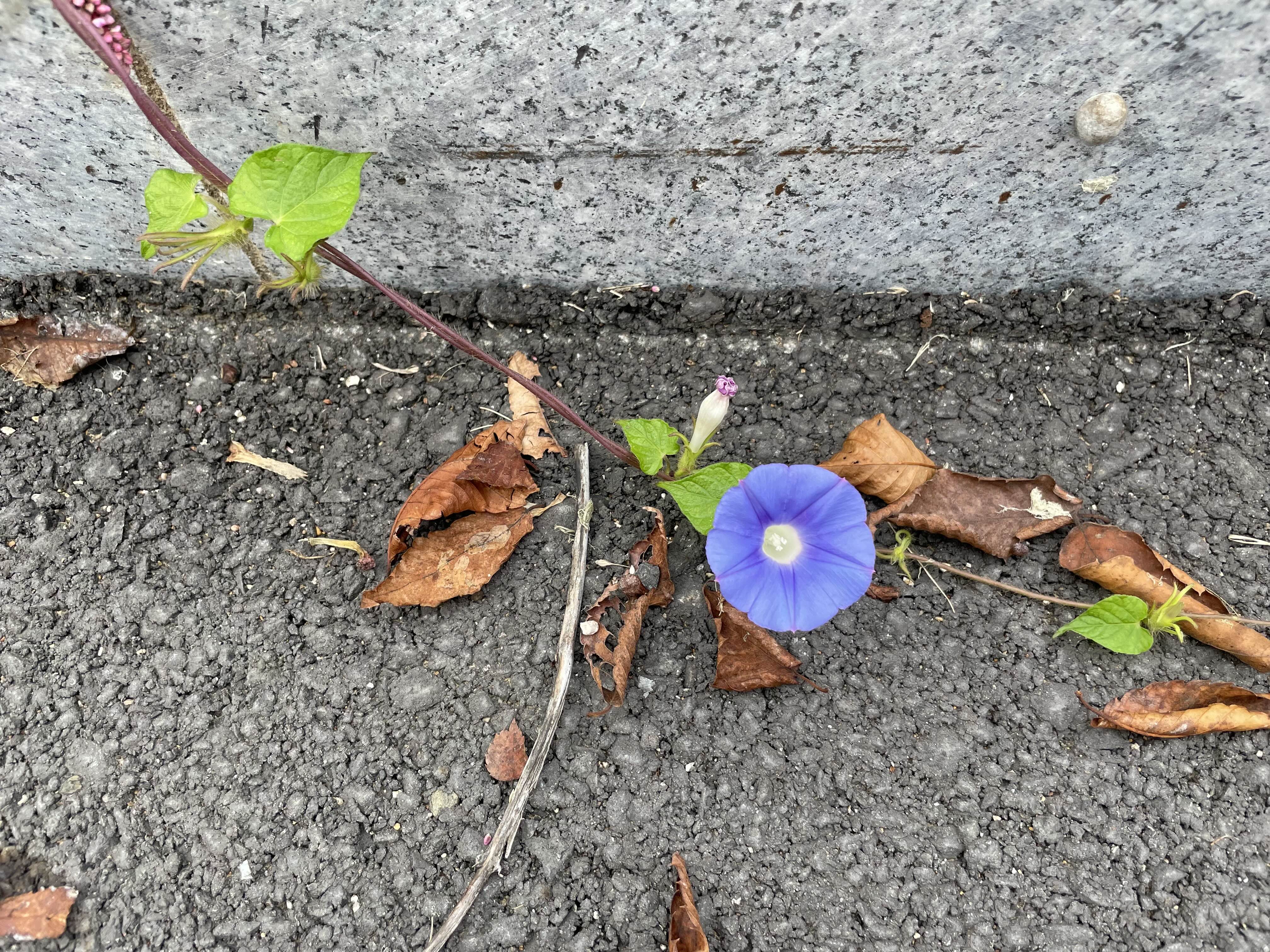 오늘의 아침 산책. 멀리서 보니 보라색 꽃들이 흐드러져 있어 얼른 가보았더니 아스팔트 위에 핀(듯 보이는) 나팔꽃이 있었다. 설마 뿌리를 아스팔트 위에 내렸나 싶었는데, 가까이 보니 몸만 슬쩍 얹었을 뿐 뿌리는 저쪽 땅 속 깊이 튼튼하게 박혀 있었다.
